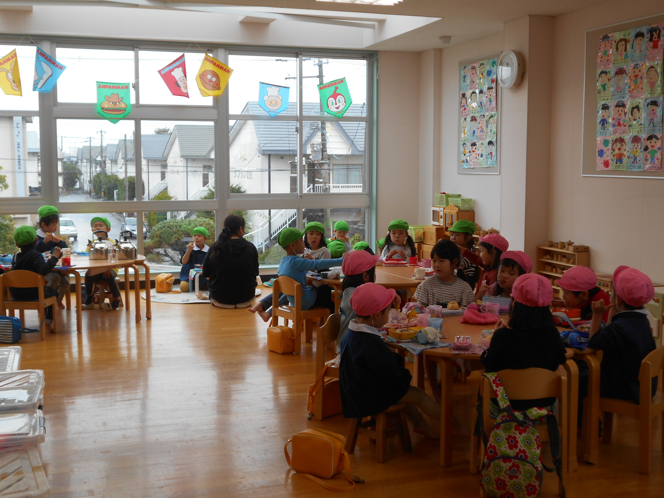 年中組は久し振りに2階ホールでお弁当を食べました。